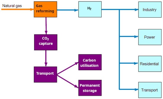 Hydrogen is considered a universal energy carrier that is able to support the decarbonization of different economic sectors [39], even those with hard-to-abate emissions. CCUS can help decrease emissions from the already existing production of hydrogen, which is based on natural gas and coal (grey hydrogen) methods, which are accountable for more than 800 Mt CO2 annually.