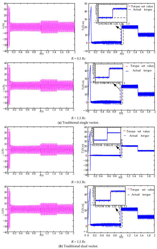 In the analysis of stator resistance errors in asynchronous motors, the motor speed is set at 1000 r/min. The analysis considers situations where the stator resistance deviates by +50% and −50%, namely, where the stator resistance parameter in the predictive model of the asynchronous motor FCS-MPC is 1.5 times and 0.5 times its actual value. The stator current and the motor’s output torque under these conditions are observed.