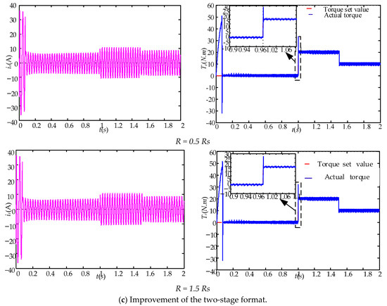 Figure 9 presents the simulation waveforms of the three control strategies with stator resistance errors of ±50%. It is indicated that these three control strategies exhibit identical dynamic response time. The single-vector FCS-MPC and the dual-vector FCS-MPC demonstrate significant torque ripple. Particularly, when the stator resistance increases to 1.5 times its rated value, the dual-vector FCS-MPC ripple amplitude reaches 5 N·m. Figure 9c shows that the improved two-stage FCS-MPC maintains good torque performance with a ripple confined to 1 N·m when a deviation in stator resistance appears. The improved strategy has the smallest torque ripple. Simulation results indicate that the improved two-stage FCS-MPC provides better control performance when there is an error in stator resistance;