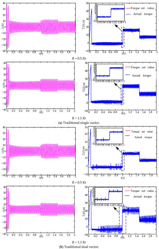 In the analysis of rotor resistance errors in asynchronous motors, the motor speed is set at 1000 r/min. The analysis considers situations where the rotor resistance deviates by +50% and −50%, namely, where the rotor resistance parameter in the predictive model of the asynchronous motor FCS-MPC is 1.5 times and 0.5 times its actual value. The output current and the motor’s output torque are examined.