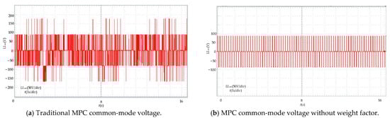 Figure 13 depicts the experimental waveforms of the common-mode voltage for both the traditional single-vector FCS-MPC and the FCS-MPC without weight factors. As shown in Figure 13a, the traditional single-vector FCS-MPC sets the common-mode voltage weight factor to 0.01, which can limit the amplitude of the common-mode voltage through a linear weighting approach. However, due to the numerous large amplitude fluctuations in the common-mode voltage, with a maximum approaching 200 V, it has a negative impact on motor insulation and system stability. Conversely, Figure 13b illustrates that the FCS-MPC without weight factors can effectively restrict the amplitude of the common-mode voltage to around 80 V, approximately one-sixth of the DC voltage. This indicates that the common-mode voltage is effectively controlled.