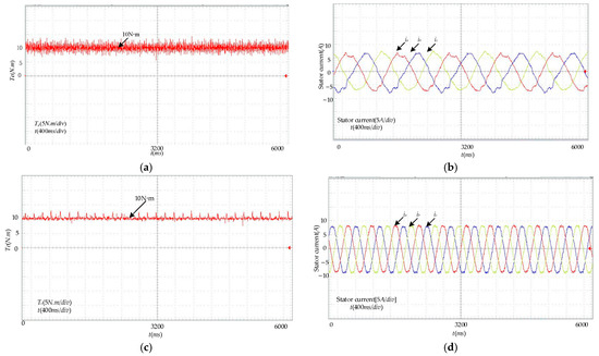 Figure 14 demonstrates the steady-state experimental waveforms based on the single-vector FCS-MPC without weight factors and the improved two-stage FCS-MPC without weight factors. As can be seen in Figure 14a,c, the average torque ripple for the single-vector FCS-MPC without weight factors is approximately 2 N·m, The improved two-stage FCS-MPC without weight factors exhibits an average torque ripple of approximately 1 N·m, effectively reducing the output torque ripple of the asynchronous motor. According to Figure 14b,d, the improved two-stage FCS-MPC has better current sinusoidality compared to the single-vector FCS-MPC without weight factors.