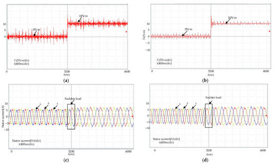 Figure 15 presents the dynamic experimental waveforms based on the single-vector FCS-MPC without weight factors and the improved two-stage FCS-MPC without weight factors. According to Figure 15a,b, under dynamic conditions, the average torque ripple for the single-vector FCS-MPC without weight factors is approximately 3 N·m, with significant torque ripple and a maximum amplitude over 2 N·m. In contrast, the average torque ripple for the improved two-stage FCS-MPC without weight factors under dynamic conditions is approximately 2 N·m, without any significant torque ripple. The experimental results demonstrate that the improved two-stage FCS-MPC without weight factors can effectively reduce the output torque ripple of the asynchronous motor, exhibiting excellent torque dynamic characteristics. As shown in Figure 15c,d, when a sudden load is applied, the improved two-stage FCS-MPC shows better current sinusoidality compared to the single-vector FCS-MPC without weight factors. The effectiveness and feasibility of the improved two-stage FCS-MPC without weight factors are well validated.