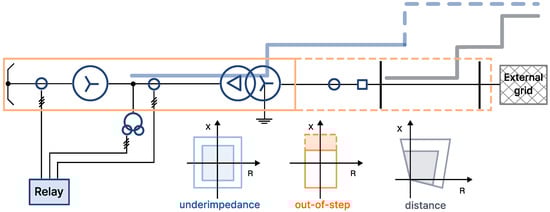 Relay connection, extent of underimpedance protection zones (blue), their coordination with distance protection of the incident TL (gray), along with their respective polygonal protection characteristics. Out-of-step protection zones and characteristic (orange) are superimposed as well.