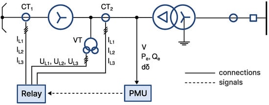 Classification of power swings (as seen from the generator terminals), emanating from short-circuit events within the network, is tackled by means of the SVM binary classifier. It uses a radial basis function (RBF) kernel and distinguishes between stable and unstable generator swings from the PMU signals measured at the generator terminals. Figure 2 depicts connection of the relay and a PMU to the generator. The PMU collects phase voltage (V), active () and reactive () power and rotor angle deviation (), as time-domain signals.