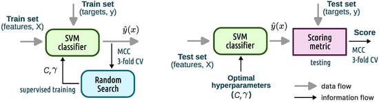 Training and test sets are then created using the stratified shuffle split strategy, so that 80% of data is used for training and remaining 20% for testing. Stratified shuffling preserves class imbalance while randomly distributing instances. The last data preparation step considers standardization of features (i.e., centering and scaling to unit variance). Figure 3 graphically represents training and test phases of the model building process. The SVM classifier has two hyperparameters that need to be fine-tuned during training. These are the classifier’s regularization (C) and the RBF kernel coefficient (). Classifier regularization (as a squared penalty) trades off misclassification of training examples against simplicity of the decision surface [25]. Kernel coefficient defines how much influence a single training example has on the overall decision boundary. Both hyperparameters are initially drawn from exponential distributions: , and optimized using a random search (for 200 iterations) with a three-fold cross validation on the training data set. Class weight balancing is used during training, where class weights are adjusted inversely proportional to class frequencies in the input data.