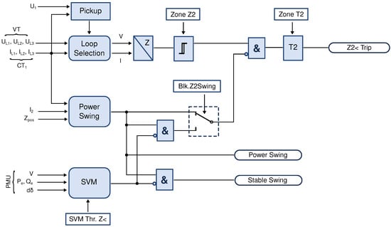 Power swing detection logic of the 7UM62 relay, in particular, is based on measuring the speed of an impedance vector trajectory during its crossing between two polygonal characteristics [5]. This logic is here reinforced by introducing another external binary signal from the SVM classifier (Figure 4), which means that the underimpedance protection is blocked only during stable swings (and not during all swings). A stable swing is determined by combining decisions from the traditional relay power swing detection logic (based on a polygonal characteristic and impedance trajectory) with that of the SVM classifier (which distinguishes between stable and unstable power swings based on PMU measurements). This increases the decision’s validity, because of its need to satisfy conditions imposed by two independent sources. In addition, parameter “SVM Thr. Z<” enables user to set the classifier’s decision probability threshold level in order to minimize type I errors.
