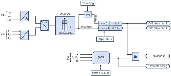 When the out-of-step protection function determines that there is a power swing (i.e., impedance trajectory is crossing through the second zone of its polygonal characteristic), the associated counter will be incremented (), [5]. Parameter “T-Holding” is used for resetting this counter. At the same time, if the SVM classifier decides that this is an unstable generator swing (from which there can be no recovery), there is no need to continue exposing the generator to mechanical stresses associated with subsequent swings (i.e., additional two or three swings) as defined by the parameter “Rep.Char.2”), [5]. In this way, by incorporating decision from the SVM classifier, out-of-step protection can trip the generator in the second zone after a single swing (instead of a total of three or four), which would considerably decrease the mechanical stresses of the machine (especially if the swing locus is close to the generator). Furthermore, any trip decision arising from the SVM decision support activates independent output signal “Trip char. 2” (see Figure 5). During relay commissioning phase, signal “Trip char. 2” can be used as an indicator only (and compared with the “O/S Trip char. 2” output for reference). In this way the commissioning period may be utilized for final fine-tuning of the classifier with actual measurements. Parameter “SVM Thr. O/S” enables the user to set the classifier decision probability threshold level in order to minimize type II errors. Finally, protection function provides an additional “Unstable swing” signal which can be used as a general zone-independent indication of an unstable power swing event.