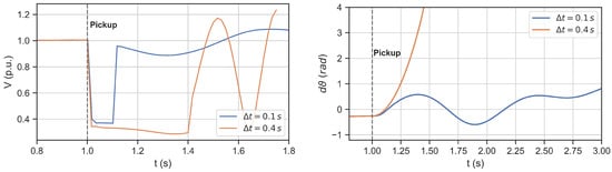 Example of generator voltage (left) and rotor angle deviation (right), during single-phase short-circuits on the incident TL that were cleared in the first (0.1 s) and second (0.4 s) distance protection zones.