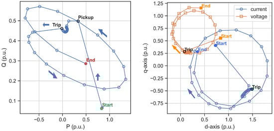 Example of trajectories for an unstable generator swing during single-phase short circuit on the incident TL. Left side shows trajectory of generator power (in the P–Q coordinate system). Right side shows trajectory of stator current and voltage (in the d–q coordinate system). Pickup and trip times of the associated distance protection are indicated for reference ( s).