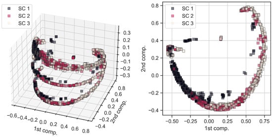 Different short-circuit events seen in the 3D (left) and 2D (right) coordinate systems of principal components (produced from the kPCA embedding); single-phase (SC 1), double-phase (SC 2) and three-phase (SC 3) faults.