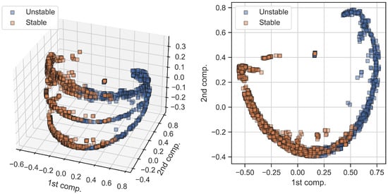 Features, extracted from the dataset of time-domain systematic simulations (see Section 2.3), can be visually depicted using the process of low-dimensional embedding. We show the results of this process here by using the kernel principal component analysis (kPCA) while projecting the original features space into the three-dimensional embedding [25]. Consequently, Figure 8 graphically depicts different short-circuit events (from all parts of the network) in 3D (left side) and 2D (right side) coordinate systems of principal components. Furthermore, SVM classifier predictions (i.e., stable and unstable generator swings), arising from these events, are also graphically depicted using the same kPCA embedding and displayed in Figure 9. By comparing Figure 8 and Figure 9, it can be clearly seen that the main source of unstable generator swings are the three-phase (SC 3) short circuit events. At the same time, single-phase (SC 1) short circuit events are far less prone to cause generator’s loss of stability. This is completely expected.