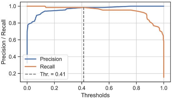 Influence of the decision threshold value on the type I and II errors is further presented graphically, by means of the confusion matrices in Figure 11, again for this test set of 200 samples. If the threshold is selected at the intersection of precision and recall curves, the number of type I and type II errors would be exactly the same. Confusion matrix, at the same time, enables deriving several other useful metrics, such as: Youden’s J–statistic, Jaccard’s index, F–measures (, ), Fowlkes–Mallows index, and others. These can be employed as a means of further examining the classifier’s performance. For example, the Jaccard’s score on the test set of 200 samples (using 3–fold cross validation) yields: .