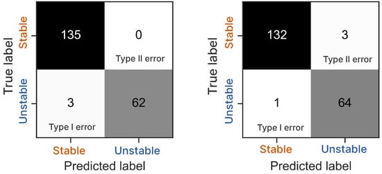 Classifier’s precision and recall for stable and unstable cases, obtained from the test set.