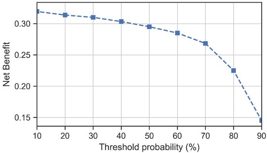 In addition, a confusion matrix forms a basis for the so-called “net benefit” analysis, which weighs the relative harms (i.e., costs) of false-positive and false-negative predictions across different threshold probabilities; see [28] for more information. The net benefit of the presented SVM model, for any probability threshold level , can be calculated from the following relation: