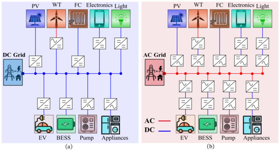 Reduction in conversion stages: (a) DC distribution system and (b) AC distribution system [10].