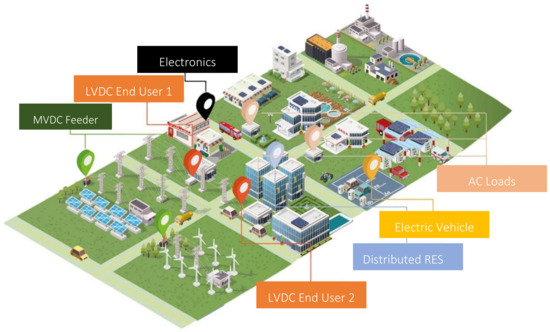 The typical AC power distribution scheme is supported by large-scale power plants, and the power generated by these plants is transmitted by HV lines. The “last mile” of the public power distribution network is supplied by a last low-voltage conversion after the energy has been distributed by medium-voltage (MV) overhead wires to smaller sites. Distributed power sources are challenging the existing structure. DC might transform the characteristics of future power networks. The goal is to produce and use our own energy around the houses. In addition to becoming energy consumers, homes and other structures will start producing their own electricity. Power can be traded in and out through the connection to the public distribution network during peak demand hours. Trading of energy resources is feasible on a local, regional, or national scale [59,60]. Instead of depending on centralized power plants, the future power grid will be structured as a network that connects and exchanges energy between several distributed power sources and loads. Most of these entities will be able to generate enough energy for their own needs and will participate in power trading to manage excess and deficiency capacity.