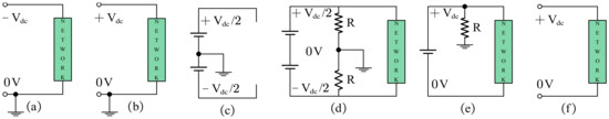 Grounding schemes: (a) positive line grounding scheme, (b) negative line grounding scheme, (c) mid-point line grounding scheme, (d) mid-point grounding scheme with high resistance, (e) one-end grounding scheme with high resistance, and (f) floating system [195,208].