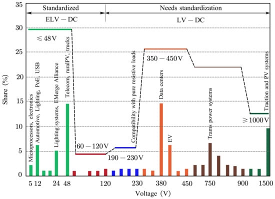 - Li, L.; Li, K.-J.; Sun, K.; Liu, Z.; Lee, W.-J. A comparative study on voltage level standard for DC residential power systems. IEEE Trans. Ind. Appl. 2022, 58, 1446–1455. [Google Scholar] [CrossRef]