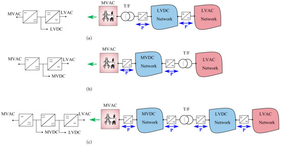 The authors of [19] use MT-DC in the distribution network to distribute EV charging demand over several transformers, easing network congestion and supporting more EV adoption. The authors of [78] examined how LV distribution systems have developed through time, beginning with conventional AC passive networks and moving on to the anticipated use of hybrid AC/DC systems. Last-mile distribution systems now have the technical and financial wherewithal to revive DC networks and integrate new technologies. However, the authors believe that the most cost-effective method of incorporating the latest technologies into the existing AC networks is the harmonious cohabitation of both systems via the development of hybrid AC/DC networks. Another example of a typical application is a field test of an LVDC distribution network at 750 Vdc, conducted in Finland [79]. In rural parts of Finland, the 20/0.4 kV AC distribution system becomes more expensive than the LVDC distribution system once the distance between substations approaches one kilometer. Reference [61] suggested control algorithms for a multi-voltage-level DC network to enhance the utilization of renewable energies and address the coordinated and interconnected challenges associated with distributed renewable energies and urban power load.