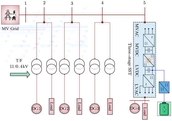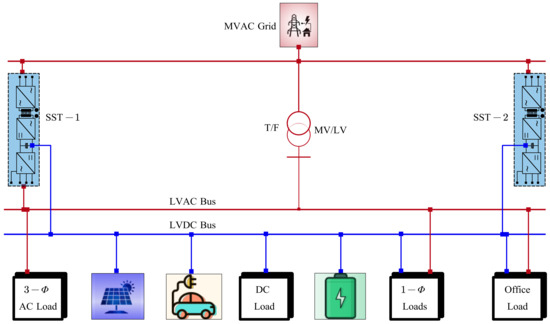 A small naval power system was used as a model in [72] to investigate the standard DC/AC power grid to address the neutral voltage shift issue. The proposed research involved the utilization of a DC/DC buck converter with an isolation transformer and a high-resistance ground. As a component of the National Science Foundation-funded Future Renewable Electric Energy Delivery and Management Systems Center (FREEDM), a non-arcing DC connection was developed for a 380 Vdc [86]. In another study that was part of the same project, the traditional electromagnetic transformer was replaced with an SST [87]. Another study showed that DC loads can be integrated at the DC bus, reducing conversion losses due to the DC intermediate stage provided by SST [88].