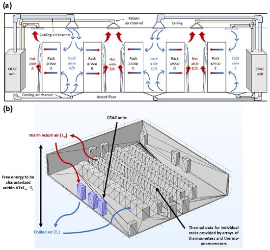 Figure 1a is a plan view of the server room showing the air-cooling system. The CRAC units cool air to 18 °C and emit the chilled air into the cold aisles of the server room via ceiling and ground vents. The server room has 72 ceiling cold vents (24 in each cold aisle) and 72 floor cold vents (24 in each cold aisle); each vent has length and width dimensions of 0.25 m. The servers in the rack groups draw the chilled air into their central processing units and graphic processing units, and, at the same time, emit hot exhaust that first mixes with the air in the hot aisle and is then drawn to the CRAC units via ceiling hot vents. The server room has 15 ceiling hot vents (5 in each hot aisle) with length and width dimensions of 0.58 m. The server room air-cooling system keeps the whole server room temperature relatively constant at approximately 21 °C. The cooling process is closed-loop; the CRAC units do not ventilate external air into the computer room, and thus, the airflow rate of warm return air entering the CRAC units and the airflow rate of chilled air emitted from the CRAC units are equal.