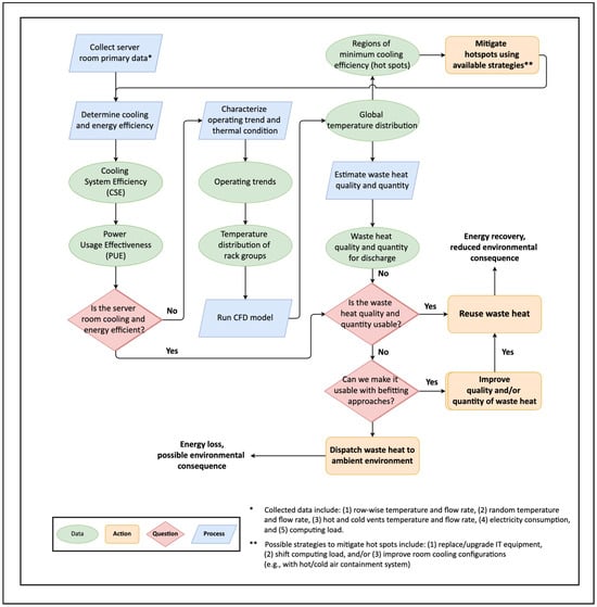where ICT equipment power is the power required by server, storage, and network equipment, and total facility power (i.e., the power required to run the server room) comprises both ICT equipment power and auxiliary equipment power (e.g., lighting and HVAC). If CSE and PUE are better than or equal to the current industrial benchmarks (0.8 KW/ton for CSE and 1.6 for PUE) [,], the system is considered to be cooling- and energy-efficient and a waste heat analysis is performed (discussed later). If the system is considered to not be cooling and energy efficient, then the next step is to analyze operating trends and thermal conditions.