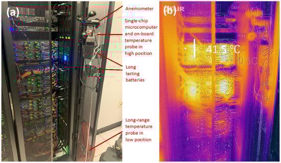 (a) Photograph of fabricated thermo-anemometer installed in a rack facing a hot aisle; (b) thermogram of the rack taken by FLIR ONE Pro, which shows the highest temperature as 41.5 °C.