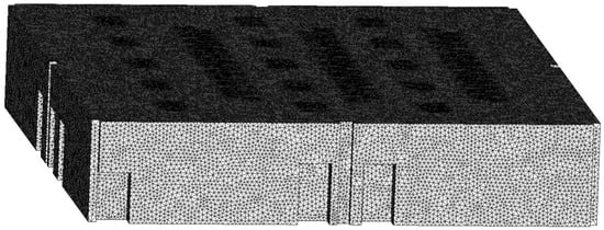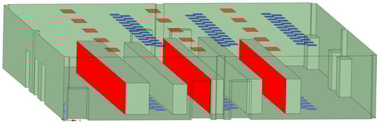 A CFD model to simulate server room airflow and temperature was developed using ANSYS Workbench (Canonsburg, PA, USA); the room geometry was created, a computational mesh was generated, and CFD equations were solved. Figure 4 shows the HPC room geometry created using the SpaceClaim tool. The average temperature and velocity for the cold air coming from the ceiling vents were initially set at 18.0 °C and 0.35 m/s. The average temperature and air velocity for the cold air coming from the floor vents were initially set at 18.0 °C and 0.42 m/s.