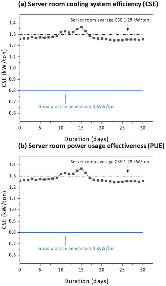 The data in Figure 6 show CSE and PUE indices calculated for the server room over one month. In Figure 6a, the daily CSE values range from 1.25 to 1.37 KW/ton; the 30-day average is 1.28 kW/ton. This average value is higher than the good practice benchmark of 0.8 kW/ton [,]. In Figure 6b, the daily PUE value ranges from 1.7 to 5.2; the 30-day average is 2.5. This average value is higher than the US average value of 1.6 [].
