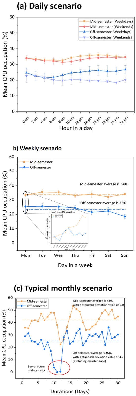 Mean CPU occupation was used to characterize the server room operating trends for the daily, weekly, and monthly scenarios. For each scenario, peak and off-peak cases are categorized according to the following: (a) mid-semester (weekday), (b) mid-semester (weekend), (c) off-semester (weekday), and (d) off-semester (weekend). Row-wise temperature data collected from the hot and cold aisles for each rack group over a 30-day period was used to characterize the server room thermal conditions.