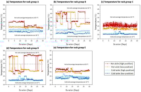Row-wise temperature data and average row-wise temperature for (a) rack group A, (b) rack group B, (c) rack group C, (d) rack group D, and (e) rack group E.