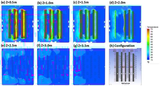 Temperature contour plots showing the horizontal temperature distribution for several rack heights: (a) Z = 0.5 m, (b) Z = 1.0 m, (c) Z = 1.5 m, (d) Z = 2.0 m, (e) Z = 2.5 m, (f) Z = 3.0 m, (g) Z = 3.5 m, and (h) configuration of server room (with open aisles) rack groups and aisles. Hot spots were identified horizontally in the middle and at the ends of rack groups.