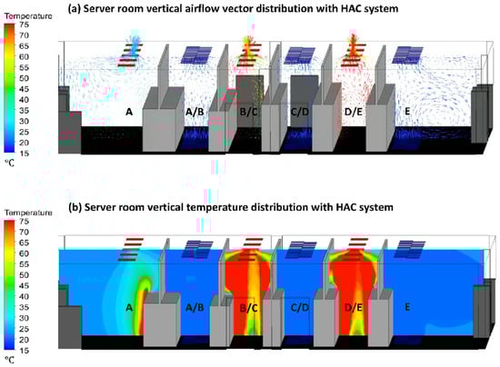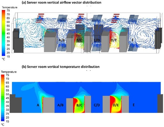 CFD simulation results for the improved server room with an HAC system are shown in Figure 12. As can be seen in Figure 12a, the HAC system confines the hot exhaust and prohibits it from mixing with the chilled air after leaving the hot aisles. Because the hot exhaust in aisles B/C and D/E is contained, the aisle temperatures are much higher than they are in Figure 10a. Figure 12b shows that the HAC system prevents chilled air from bypassing the server inlets; instead, chilled air is available to cool the servers.