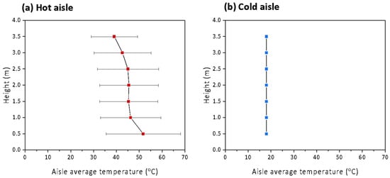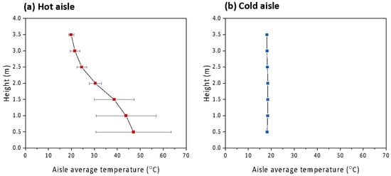 (a) Hot aisle vertical average air temperature and (b) cold aisle vertical average air temperature in the server room with the hot air containment system.