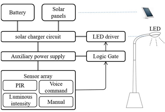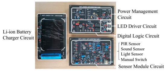 The intelligent controller’s structural diagram is depicted in Figure 1. It primarily encompasses (1) the DC power supply unit, which furnishes DC power for detection and control circuits via DC-DC conversion. This unit comprises three modules: a boost circuit, a negative voltage generation circuit, and a battery-charging circuit [5]. (2) The sensor detection unit comprises four modules: the light detection circuit, human infrared detection circuit, sound detection circuit, and manual switch circuit, which yield multiple logic levels. (3) The logic control unit transforms these multiple logic levels into control signals to regulate the operation, shutdown, and brightness of LED street lights. The brightness of the LED light is adjusted by the PWM modulation circuit, and the duration of high-brightness lighting is determined by the timing circuit. (4) The LED driver unit accepts the control signals and drives the LED street lights to operate with a constant current.