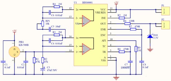 The schematic diagram of the infrared pyroelectric sensing signal processing circuit is shown in Figure 2. The main parameters include the following.
