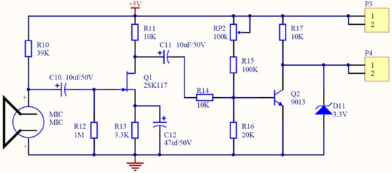 The schematic diagram depicts the operation of the sound detection and processing circuit, as shown in Figure 3. The circuit first captures the sound signal through an electret microphone and converts it into an electrical signal. This signal is then amplified through a two-stage amplification circuit to produce a voltage signal corresponding to the sound signal.