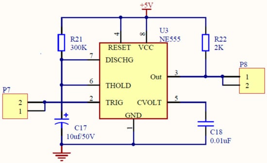 The timing circuit is utilized to produce intense illumination for a set period, employing the standard monostable circuit configuration of 555 [13] integrated circuits. The circuit diagram is depicted in Figure 6. The input terminal experiences a falling edge and is non-retriggerable.