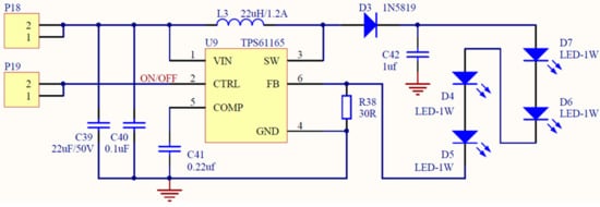 The schematic diagram of the LED driver circuit is shown in Figure 8, mainly composed of a TPS61165 boost converter [17]. By changing the input voltage of the VIN pin and the control signal of the CTRL pin, LED on/off and brightness control can be achieved.