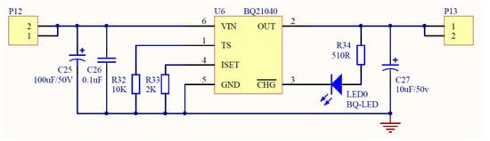 The schematic diagram of the charging circuit is shown in Figure 9. This design uses a BQ21040 integrated charger [18] to charge lithium-ion batteries using solar panels. According to the typical parameter in the BQ21040 data manual , taking , the output fast charge current can be obtained as:
