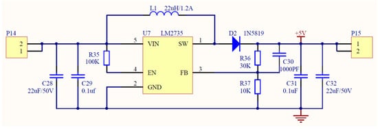 The boost circuit’s schematic diagram is depicted in Figure 10. This design employs the LM2735 integrated circuit [19] to elevate the DC voltage from the 3.7–4.2 V output of lithium batteries to 5 V, and accomplishes voltage stabilization. Utilizing a boost topology based on dedicated integrated circuits enables boost conversion to be achieved under voltage closed-loop feedback control.