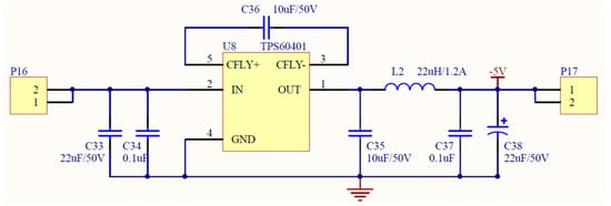 The diagram in Figure 11 illustrates the schematic of the negative voltage generation circuit. This design utilizes the TPS60401 integrated charge pump voltage converter [20] to accomplish polarity reversal from +5 V to −5 V. Following the passage through series inductors and parallel capacitors, a stable −5 V DC voltage is produced. According to the typical parameters outlined in the TPS60401 data manual, the capacitance is chosen as 10 μF. The fixed switching frequency is 20 kHz, and the inductance is selected as 22 μH. The capacitance is also chosen as 22 μF.