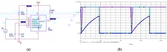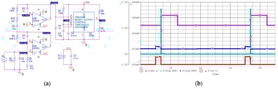To construct a timing circuit based on the design schematic, we completed quiescent point analysis and transient analysis, and the simulation results are shown in Figure 16a,b. The transient analysis results indicate that the falling edge of the input signal triggers the timing circuit. The capacitor begins to charge, and the circuit outputs a high level with a pulse width of approximately 3.3 s. When the voltage of the capacitor reaches 3.3 V, the capacitor begins to discharge, and the circuit outputs a low level, which is consistent with the design principle.