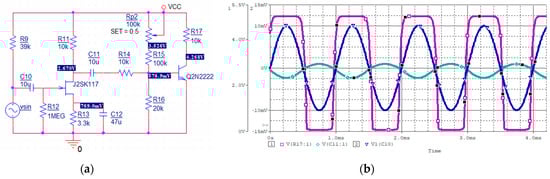 To create a sound detection and processing circuit based on the provided design schematic, completing both quiescent point and transient analysis is necessary. The simulation results are illustrated in Figure 13a,b. According to the transient analysis, when the circuit receives a 10 mV, 1 kHz sine signal, the output remains in a saturated state, aligning with the design principle.