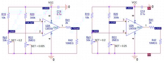 To construct a light detection and processing circuit based on the design schematic, we replaced the photosensitive resistor with an adjustable resistor and completed the quiescent point analysis. The simulation results are shown in Figure 14. The analysis indicated that the circuit produces low and high output levels when the adjustable resistance values are 50 kΩ (representing illuminated) and 500 kΩ (representing non-illuminated), respectively, aligning with the design principle.