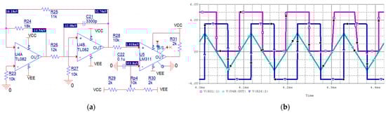 To construct a PWM generation circuit based on the design schematic, we completed quiescent point analysis and transient analysis, and the simulation results are shown in Figure 15a,b. The transient analysis revealed that the triangular wave generation circuit produces positive and negative alternating triangular waves, subsequently generating a square wave with an adjustable duty cycle amplitude of 5 V through the LM311 comparator.