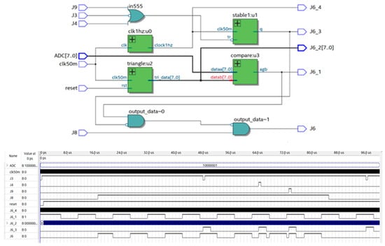 The logic circuit, as per the design schematic, utilizes the Intel MAX 10 series FPGA (model 10M50DAF484C7G [21]). The triangular wave generator, Triangle: u2, and the ADC [7:0], as a comparator input, are employed to produce PWM waves. The simulation was conducted using ModelSim (Quartus-lite-17.1.0.590-windows), and the results are depicted in Figure 17.