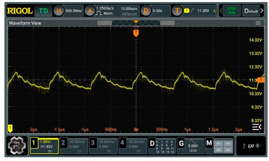 When the LED illuminated and the intensity was high, oscilloscope channel 1 was connected to the SW pin of the TPS61165 driver chip, and the waveform was observed as depicted in Figure 19. Based on the waveform measurement, the operational frequency of the driving circuit was 1.22 MHz, and the average output voltage was 11.32 V, which is largely consistent with the intended value. During practical measurement, the sampling resistance can be set to 2 Ω, resulting in an output current of approximately 100 mA, aiming to reduce LED brightness and output power for ease of debugging.