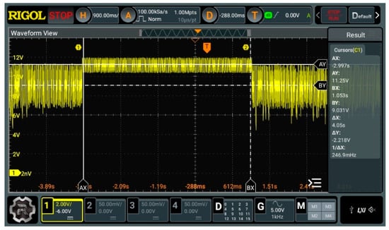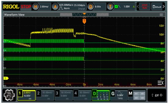 The methodology for maintaining the connection of the oscilloscope logic channel in Section 4.3 and linking the oscilloscope analog channel CH1 to the SW pin of the LED driver chip TPS61165 should be upheld. The lighting simulation involves using a flashlight and using the output of the light control circuit as the trigger source for the oscilloscope, capturing the waveform with a single trigger, as illustrated in Figure 24. Upon observation of the waveform, it is evident that the transition of the lighting detection circuit output from a high level (representing no illumination) to a low level (representing illumination) causes the LED driver control signal to shift from PWM mode to low-level output mode, indicating the change in the LED light’s operational state from low-brightness illumination to off. The output waveform of the oscilloscope analog channel demonstrates a gradual decrease in the output voltage of the driving circuit to 5 V as the output of the optical control circuit changes. As per the cursor measurement, the output voltage drop process in the figure takes approximately 10 ms.